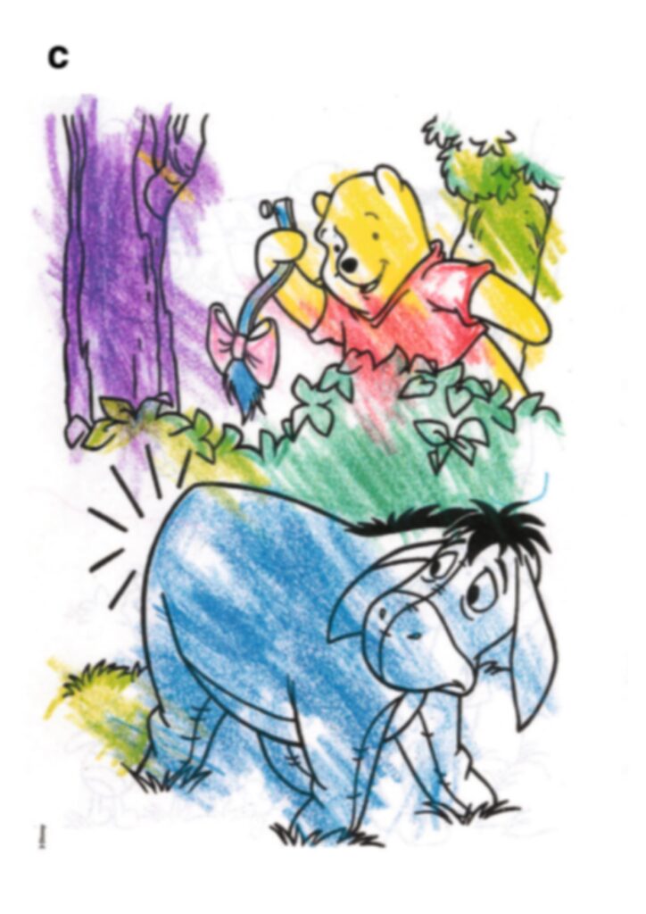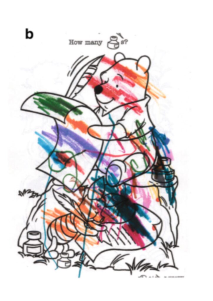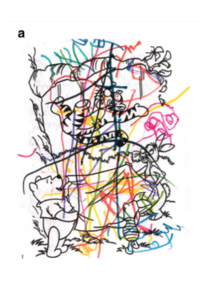 Rysunek poniżej przedstawia kolorowankę dziewczynki przed rozpoczęciem terapii w komorze hiperbarycznej (rys. a), a następnie (rys. b) po tygodniowej terapii (5 sesji godzinnych, raz dziennie). W kolejnych tygodniach, (15 godzinnych sesji w ciśnieniu 1,5 ATA) dziewczynka zaczyna dobierać odpowiednie kolory do pokolorowania Kubusia Puchatka i liści . Po 20 godzinach terapii zaczyna dobrze zachowywać granice pola do kolorowania.